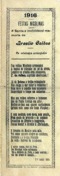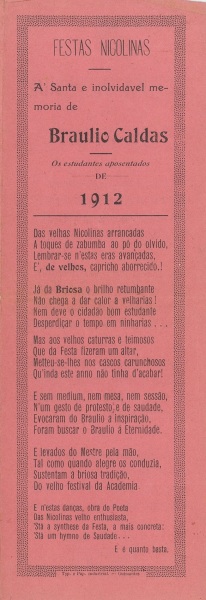 Nas danças de 1912, organizadadas pelos estudantes aposentados, ao texto de Bráulio Caldas foi anteposto o seguinte texto, que seria repetido em 1916: