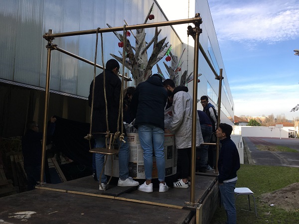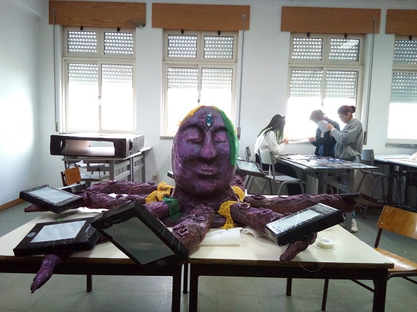 Os objetivos da atividade: 1. Perceber a importância da investigação numa criação original; desenvolver um projeto como antevisão de uma construção; executar a construção de um projeto. Começamos por estudar a temática no contexto da religião e o seu reflexo numa lenda popular, descodificando os seus elementos e personagens aglutinadores de uma história: a árvore, a maçã, o "Eden" (paraíso), o Adão e a Eva. Na construção de um ambiente cénico/teatral os elementos são tratados de forma ilustrativa dos ambientes e os personagens decorados conforme o enredo de uma ficção. A atividade decorreu com o sucesso limitado à qualidade dos meios e os alunos envolveram-se de forma satisfatória. Foram usados esferovite, cola, jornais, garrafas de plástico, ferro, tintas, leds e ferragens.