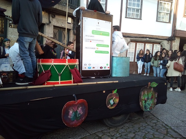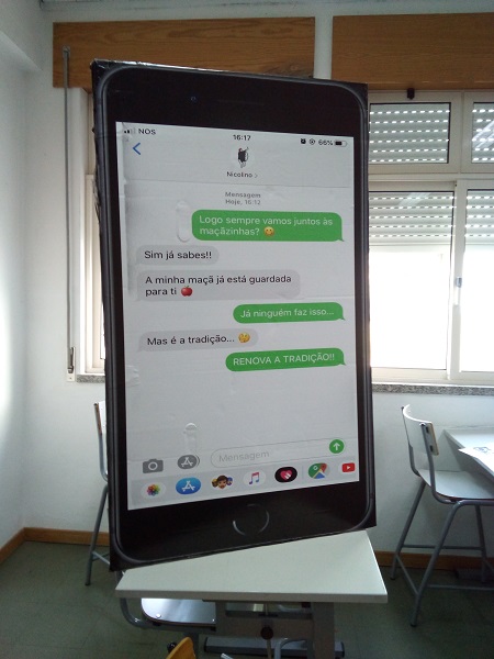 A partir daqui, quisemos desenvolver uma temática toda à volta da expressão "RENOVA A TRADIÇÃO". Com o nosso telemóvel em grandes dimensões (com um texto alusivo às maçãzinhas e ao nosso tema); as duas lanças cruzadas que trespassam de um lado uma maçã e de outro um telemóvel, representam a interseção entre passado e presente no âmbito do tema do amor; e finalmente, o nosso polvo, um ser aquático envolvido em redes e com telemóveis nos tentáculos, faz alusão à poluição marinha, à multiplicidade de pessoas que utilizam diariamente o telemóvel, lembrando que nada nem ninguém consegue escapar ao progresso tecnológico.