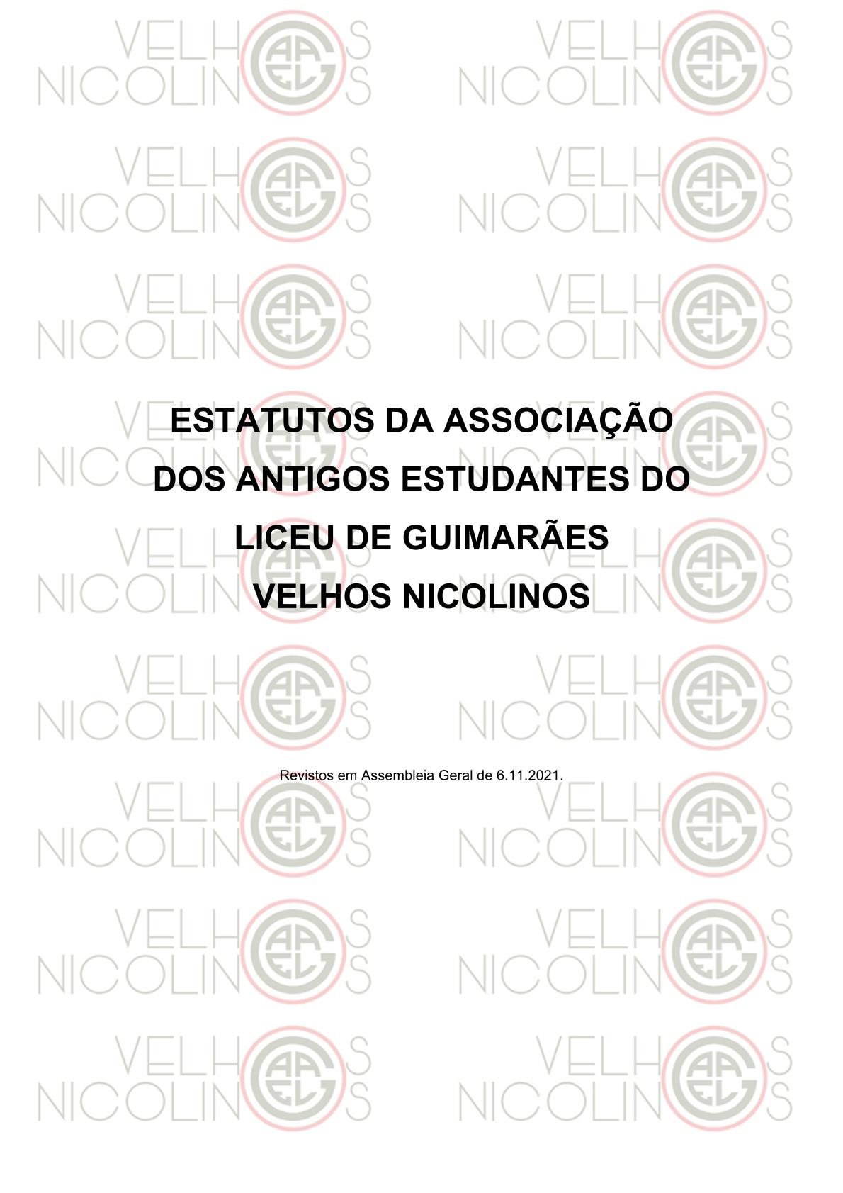 1. A Associação dos Antigos Estudantes do Liceu de Guimarães/Velhos Nicolinos é uma Associação sem fins lucrativos que também usa a sigla AAELG/Velhos Nicolinos ou o acrónimo AAELG/VN e é uma estrutura representativa dos Antigos Estudantes do Liceu de Guimarães e de todos os Velhos Nicolinos.