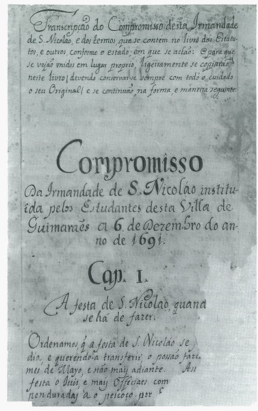 Art.° 2.°- (Natureza) é uma associação de fiéis, erecta em pessoa jurídica canónica pública, por iniciativa dos estudantes de Guimarães em 1691.