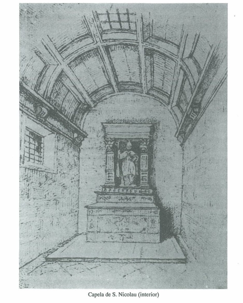 Da primitiva capela de S. Nicolau, construída em 1663, ficou-nos uma descrição minuciosa no conhecido contrato celebrado pelos mordomos da confraria com o pedreiro Domingos Lourenço. Nos termos desse contrato, as espessas paredes do pequeno templo deviam ser feitas de pedra de galho em esquadria, sendo de pedra fina o pavimento interior em lisonja, o degrau de entrada e o degrau do altar, os cunhais exteriores com capiteis dóricos e vasas coríntias, a abóboda de berço de quinze caixotões dividida em três tramos por arcos salientes. Tanto exteriormente como no interior, ao alto das laterais, corria um friso com cornija e arquitrave. Um cachorro de pedra sustentava o madeiramento do telhado e um algeroz de meia cana acompanhava a empena. O recinto recebia luz por uma fresta aberta numa das paredes laterais, e a ele se acedia por um arco redondo, assente em pilastras de bases coríntias e capiteis dóricos. O altar do Santo, de pedra tosca, erguia-se contra a parede do fundo.