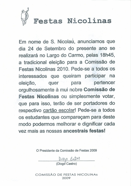- A eleição realiza-se na última sexta-feira de Setembro junto do chafariz renascentista de três taças, da autoria do Mestre Gonçalo Lopes em 1583, por convocação por “Edital Nicolino” divulgado nas escolas com secundário (10º ao 12º ano) de Guimarães e nas redes sociais.